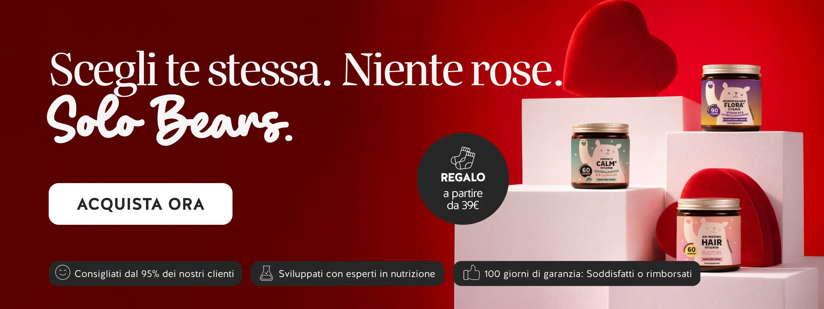 È “dalle donne per le donne” il nostro motto sui prodotti per la salute femminile. Soffri di sintomi da sindrome premestruale? O sei alla ricerca di un integratore per la menopausa? I nostri prodotti sono studiati per aiutare il tuo corpo e sostenerlo con vitamine e minerali importanti. Ma sappiamo anche che il desiderio di avere figli e l'allattamento al seno sono altri due aspetti importanti nella vita di una donna. I nostri orsetti con ingredienti come l'acido folico e il ferro ti aiutano a sostenere in modo ottimale il tuo corpo e ad aumentare il tuo benessere.