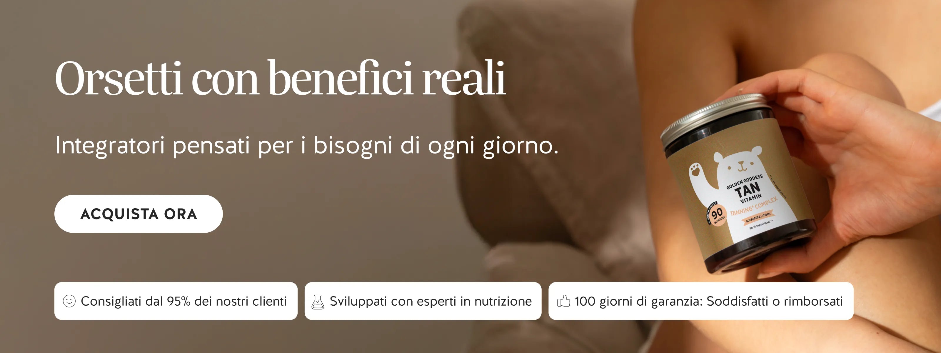 Benvenuti su Bears with Benefits - i tuoi esperti di integratori alimentari naturali, efficaci ma anche deliziosi. Abbiamo eliminato le noiose pillole o capsule e abbiamo confezionato i nostri ingredienti di alta qualità in piccoli orsetti gommosi! Inoltre, la maggior parte dei nostri orsetti sono vegani e, naturalmente, assolutamente privi di test sugli animali. Insieme al medico nutrizionista Dr Anne Latz e allo scienziato nutrizionista Nassim Jamalzadeh, miglioriamo costantemente i nostri prodotti per garantirti il massimo livello di qualità. Offriamo un'ampia gamma di prodotti appositamente studiati per le tue esigenze. Che tu stia cercando integratori per rinforzare i capelli, migliorare la tua pelle o supportare la tua salute generale, abbiamo il prodotto giusto per te.