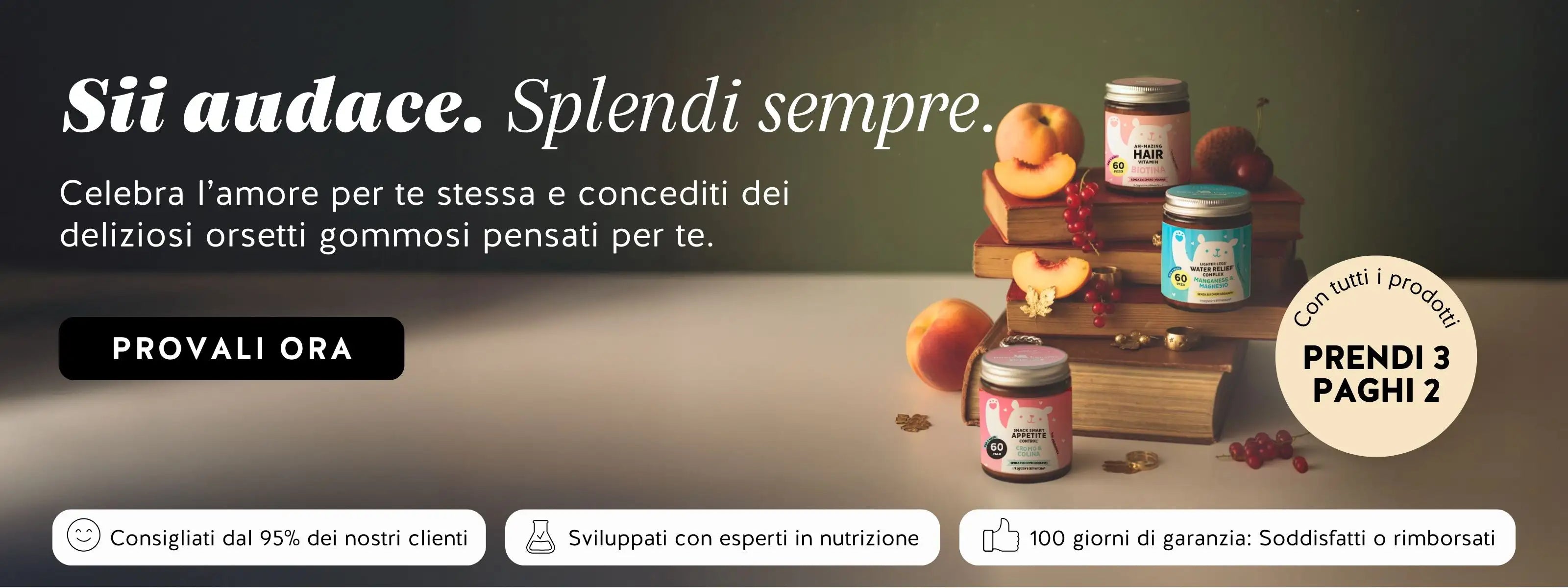 Benvenuti su Bears with Benefits - i tuoi esperti di integratori alimentari naturali, efficaci ma anche deliziosi. Abbiamo eliminato le noiose pillole o capsule e abbiamo confezionato i nostri ingredienti di alta qualità in piccoli orsetti gommosi! Inoltre, la maggior parte dei nostri orsetti sono vegani e, naturalmente, assolutamente privi di test sugli animali. Insieme al medico nutrizionista Dr Anne Latz e allo scienziato nutrizionista Nassim Jamalzadeh, miglioriamo costantemente i nostri prodotti per garantirti il massimo livello di qualità. Offriamo un'ampia gamma di prodotti appositamente studiati per le tue esigenze. Che tu stia cercando integratori per rinforzare i capelli, migliorare la tua pelle o supportare la tua salute generale, abbiamo il prodotto giusto per te.