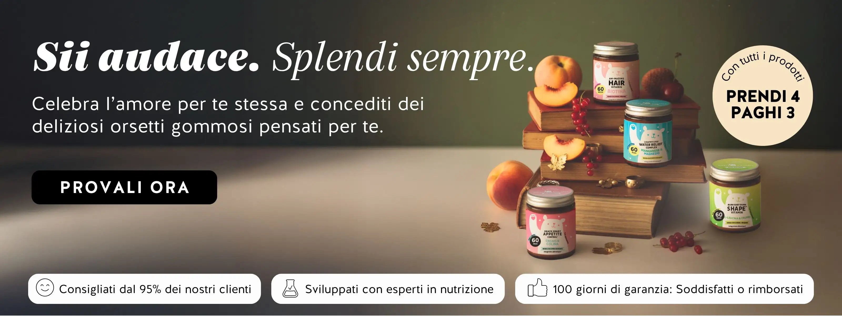 Benvenuti su Bears with Benefits - i tuoi esperti di integratori alimentari naturali, efficaci ma anche deliziosi. Abbiamo eliminato le noiose pillole o capsule e abbiamo confezionato i nostri ingredienti di alta qualità in piccoli orsetti gommosi! Inoltre, la maggior parte dei nostri orsetti sono vegani e, naturalmente, assolutamente privi di test sugli animali. Insieme al medico nutrizionista Dr Anne Latz e allo scienziato nutrizionista Nassim Jamalzadeh, miglioriamo costantemente i nostri prodotti per garantirti il massimo livello di qualità. Offriamo un'ampia gamma di prodotti appositamente studiati per le tue esigenze. Che tu stia cercando integratori per rinforzare i capelli, migliorare la tua pelle o supportare la tua salute generale, abbiamo il prodotto giusto per te.