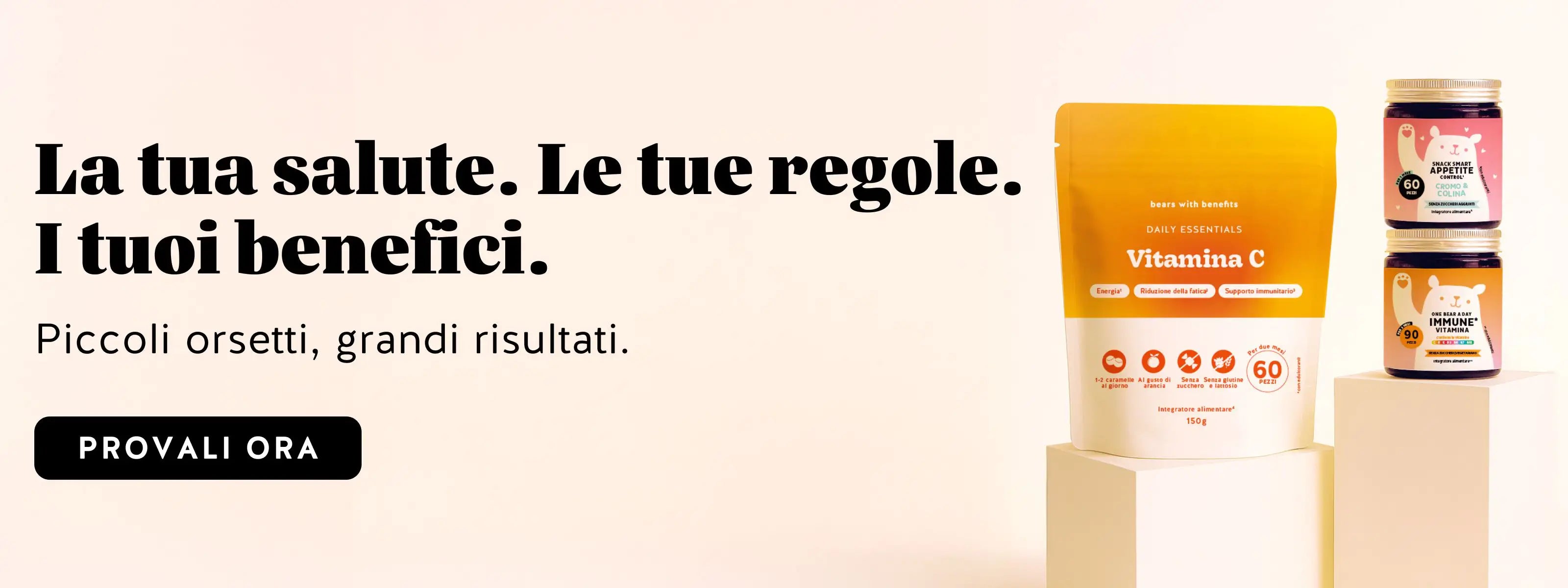 Benvenuti su Bears with Benefits - i tuoi esperti di integratori alimentari naturali, efficaci ma anche deliziosi. Abbiamo eliminato le noiose pillole o capsule e abbiamo confezionato i nostri ingredienti di alta qualità in piccoli orsetti gommosi! Inoltre, la maggior parte dei nostri orsetti sono vegani e, naturalmente, assolutamente privi di test sugli animali. Insieme al medico nutrizionista Dr Anne Latz e allo scienziato nutrizionista Nassim Jamalzadeh, miglioriamo costantemente i nostri prodotti per garantirti il massimo livello di qualità. Offriamo un'ampia gamma di prodotti appositamente studiati per le tue esigenze. Che tu stia cercando integratori per rinforzare i capelli, migliorare la tua pelle o supportare la tua salute generale, abbiamo il prodotto giusto per te.