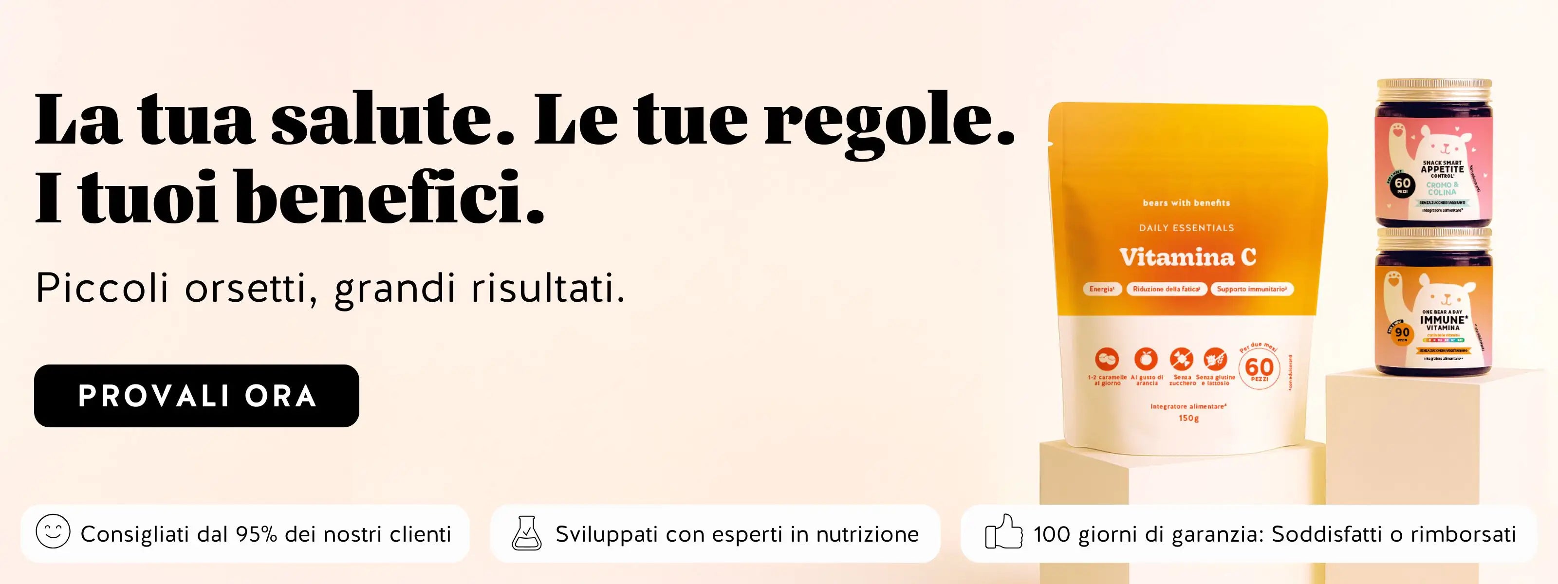 Benvenuti su Bears with Benefits - i tuoi esperti di integratori alimentari naturali, efficaci ma anche deliziosi. Abbiamo eliminato le noiose pillole o capsule e abbiamo confezionato i nostri ingredienti di alta qualità in piccoli orsetti gommosi! Inoltre, la maggior parte dei nostri orsetti sono vegani e, naturalmente, assolutamente privi di test sugli animali. Insieme al medico nutrizionista Dr Anne Latz e allo scienziato nutrizionista Nassim Jamalzadeh, miglioriamo costantemente i nostri prodotti per garantirti il massimo livello di qualità. Offriamo un'ampia gamma di prodotti appositamente studiati per le tue esigenze. Che tu stia cercando integratori per rinforzare i capelli, migliorare la tua pelle o supportare la tua salute generale, abbiamo il prodotto giusto per te.